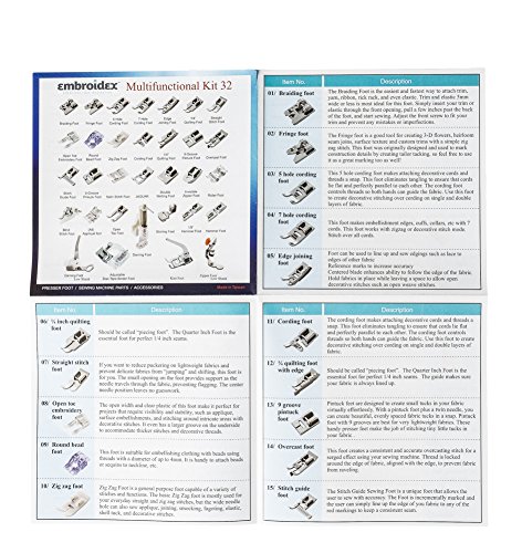 -. Feature : Can be used for most Brother, Singer, Janome / New Home, Elina, Pacesetter, Elnita, Pfaff, Viking, Juki, Kenmore, and domestic machine with a low shank system / Open Toe Embroidery Foot; Round Bead Foot; Zig Zag Foot; Cording Foot. 1/4" Quilting Foot; . Pintuck Foot Grooves; Stitch Guide Foot; Pintuck Foot 5 Grooves; Satin Stitch Foot; Zig Zag Foot, JAGUAR; Double Welting Foot; Invisible Zipper Foot; Roller Foot / Includes these feet: Darning foot Low Shank, Adjustable Bias Binder Foot, Knit Foot, Zipper Foot Braiding Foot; Fringe Foot; 5 Hole Cording Foot; 7 Hole Cording Foot; Edge Joining Foot; 1/4" Quilting Foot; .Straight Stitch Foot / Blind Stitch Foot; Applique Foot; Open Toe Foot; Darning Foot, Low Shank; Gathering / Welting Foot; Hemmer Foot; Round Hemmer Foot / Comes in a deluxe hard Plastic Case box for Easy and neat storage