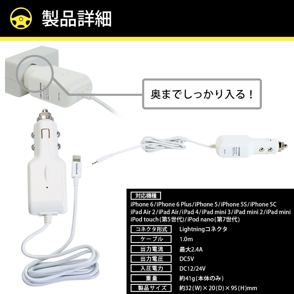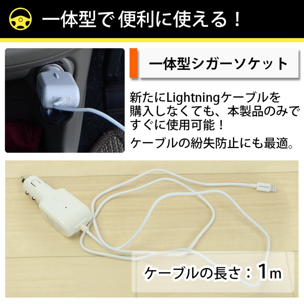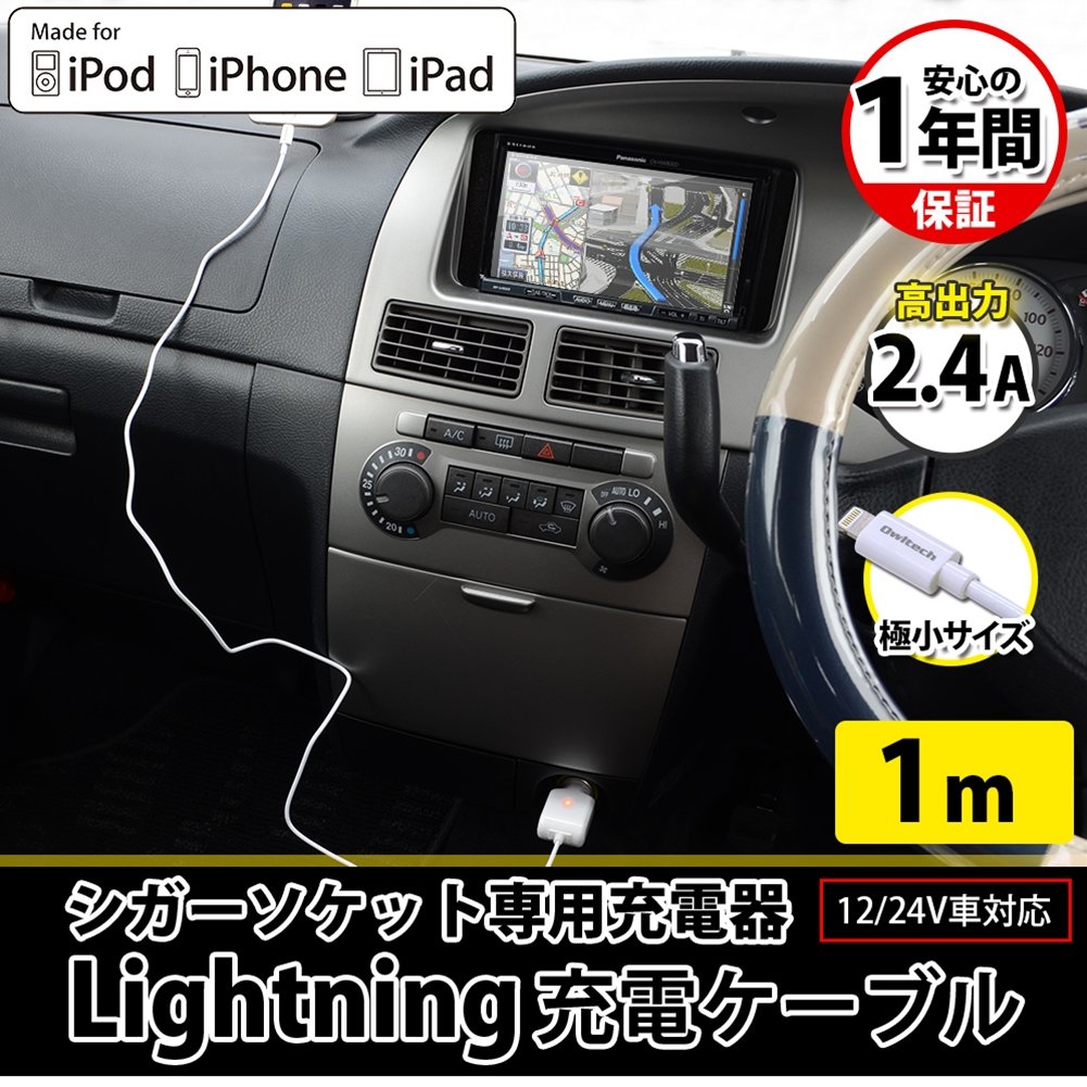 Ourutekku iPhone6s / 6sPlus / 6 / 6Plus / 5s / iPad Air / Air2 / mini4 etc. corresponding Apple Certified Lightning cable-integrated 2.4A high output corresponding cigarette lighter charger 12V / 24V