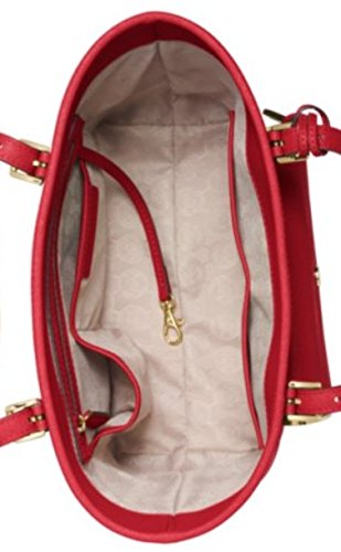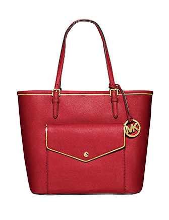 -. Brand : Michael Kors -. Color : Red -. Department : womens -. EAN : 0796856657771 -. Feature : 13" W x 10" H x 5" D size Medium (this is not a large tote bag) / Double handles with 11" drop / Red saffiano leather with gold tone metal trim throughout / Interior features 1 zip compartment, 1 zip pocket, 3 open pockets, 1 cell phone pocket and 1 key fob / Exterior snap pocket; no top closure -. PackageQuantity : 1 -. ProductGroup : Shoes -. ProductTypeName : HANDBAG -. Size : Medium -. Title : Michael Kors Jet Set Pocket Tote Specchio Medium Red Saffiano Leather -. UPC : 796856657771