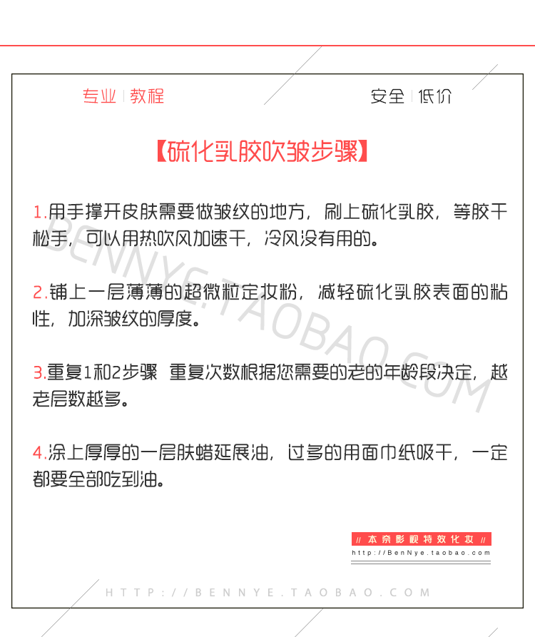 1.用手撑开皮肤需要做皱纹的地方,刷上硫化乳胶,等胶干松手,可以用热吹风加速干,冷风没有用的。