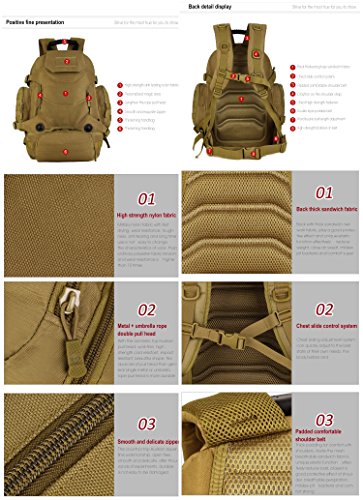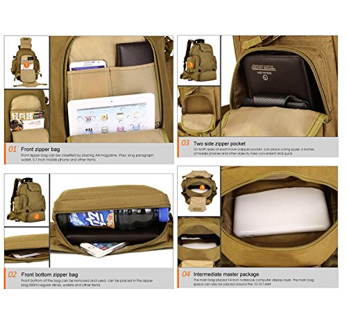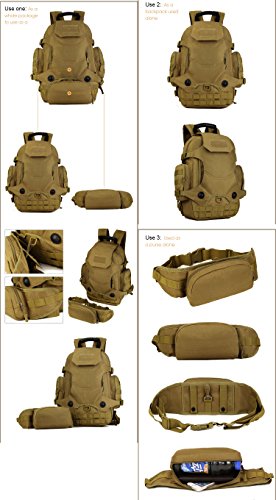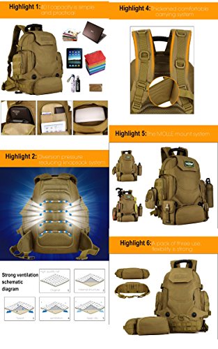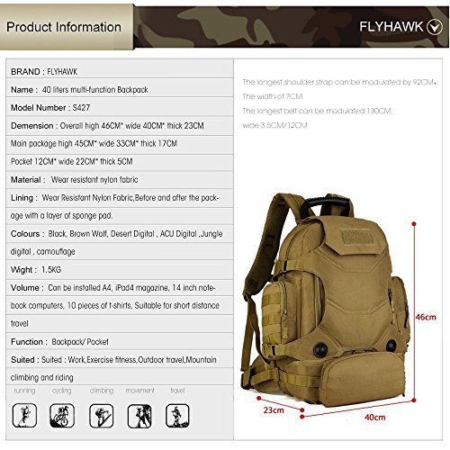 -. Feature : SUPER COLLOCATION - We can meet most of your outdoor gear combination. S427 Tactical MOLLE Backpack set of 5 color options, can be combined with the A1/A2/A3/A4/A5/A6/A7/A9/A10/A11 and other small bags with bans. Please see the product picture, there will be a combination of the show. Other combination products please find in the shop. / LARGE CAPACITY - Can please Ipad 4,Ipad Mini,A4 Magazine,14 inches laptop,10 pieces of T-shirts ,Wallet,Mobile Phones,cigarettes and other travel items. / COMFORTABLE AND PERFECT SIZE - Demension: 19.29 * 14.17 * 7.87 Inches,Main package 17.72 * 12.99 * 6.69 Inches,Pocket 8.66 * 4.72 * 1.97 Inches,Weight of 38.8 ounces.It has a very comfortable two shoulder straps,width of 7 cm.Strap using thick sandwich pads, play a good protective effect. Reduce weight feeling, breathable perspiration, high comfort. / MOLLE System - The bag body with multiple pals ribbon, can be attached to a small bag, bag accessories, kettle etc. Can also be outside the kettle, flashlight, intercom and other outdoor equipment. / WIDE VARIETY OF USES - Perfect for most sports activities like jogging, running, Climbing, hiking, mountain biking, gym, horse riding etc