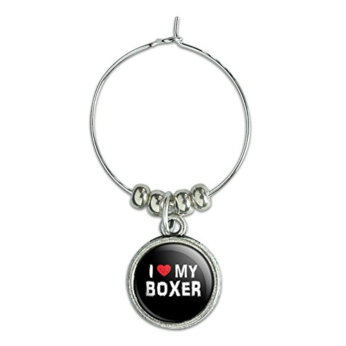 -. Brand : Graphics and More -. Feature : Unique and functional super awesome drinking glass charm / Includes the resin encased design on both sides of the 15mm metal charm / Approximate size of charm is 15mm / Sold individually / Created by Graphics and More in the USA -. Label : Graphics and More -. Manufacturer : Graphics and More -. ProductGroup : Kitchen -. ProductTypeName : KITCHEN -. Publisher : Graphics and More -. Studio : Graphics and More -. Title : Wine Glass Charm Drink Marker I Love My Dog A-B