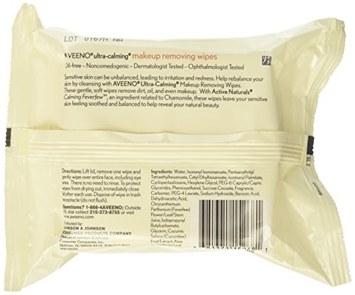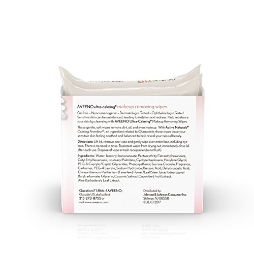 ReleaseDate : 2017-06-25 Studio : Johnson Johnson Consumer Inc. Publisher : Johnson Johnson Consumer Inc. Binding : Health and Beauty Product Description Help rebalance your skin by cleansing with Aveeno Ultra-Calming Makeup Removing Wipes. Ideal for sensitive skin, these soft, gentle face wipes remove dirt, oil, makeup, and even mascara. These cleansing facial wipes feature Calming Feverfew extract, an ingredient related to chamomile, one of nature’s effective and proven ingredients for sensitive skin. Aveeno Ultra-Calming Makeup Removing Wipes leave your sensitive skin feeling soothed and more balanced. The dermatologist- and ophthalmologist-tested formula is non-comedogenic and oil-free. 0