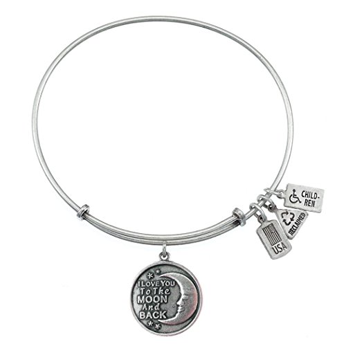 -. Binding : Jewelry -. Brand : Wind and Fire -. Department : Womens -. Feature : Antique Silver and Antique Gold finish available / Size: Expandable / Made from recycled materials in the USA / Portions of proceeds from sales of all Wind & Fire bracelets are donated to children's charities -. Label : C.G. Creations -. Manufacturer : C.G. Creations -. Model : WF-307 -. ProductGroup : Jewelry -. ProductTypeName : FASHIONNECKLACEBRACELETANKLET -. Publisher : C.G. Creations -. Studio : C.G. Creations -. Title : Wind and Fire I Love You to the Moon and Back Charm Bangle Bracelet
