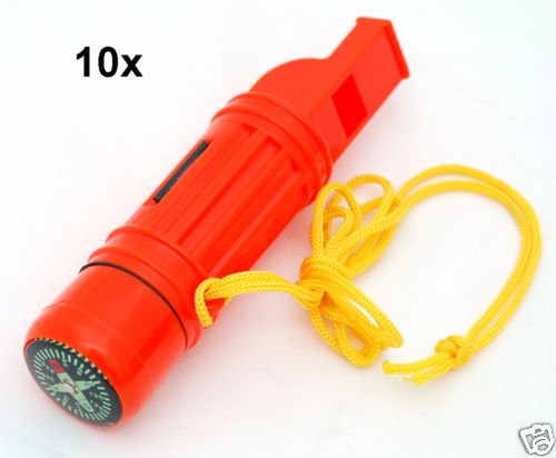 Studio : Hammers Publisher : Hammers Binding : Misc. Product Description This listing is for a lot of 10pcs brand new 5 in 1 survival whistles. The whistle is a handy multifunction survival tool that has some additional tools built in such as a liquid filled mini button compass, flint bar, survival signal mirror and a waterproof match container. A lanyard is attached for easy carry. -Item weight: 1.2oz. -Dimensions:4.5X1X1 Inch. -Color: Bright Orange. 0