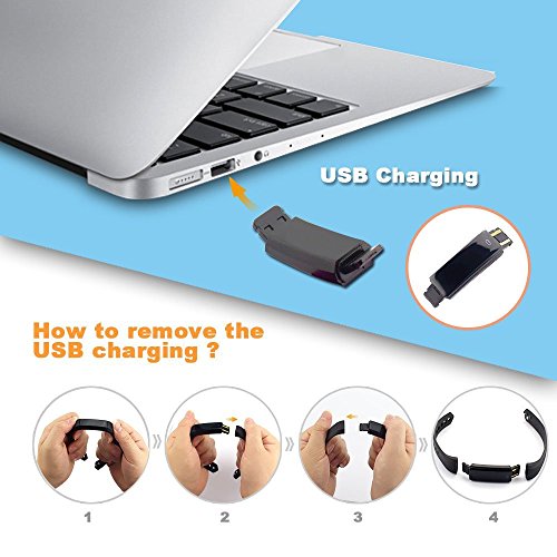 Note: Take the tracker out of the wristband before you insert to copmputer or laptop.Charging Time:1-2hours. Come with the touch button.