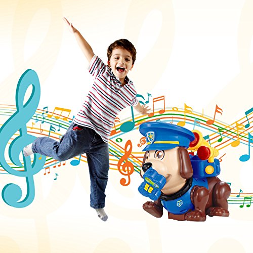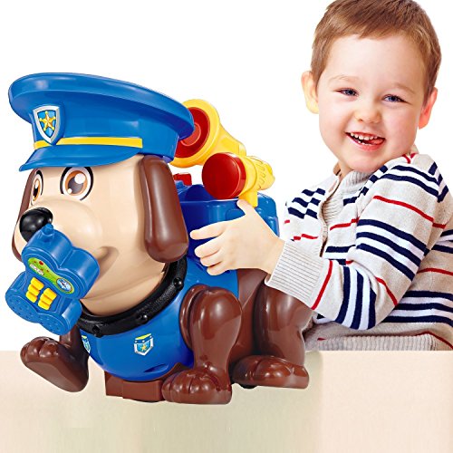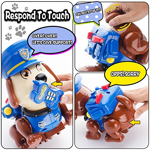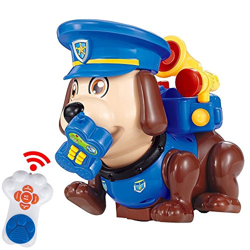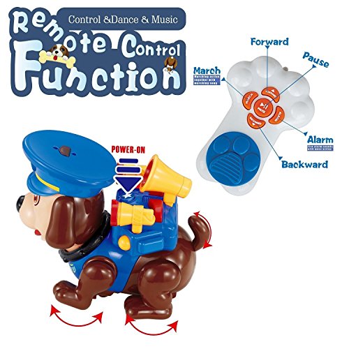 Self-introduction of TomHi! My name is Tom. I am a police dog. I hope you will like me, my little friend! Firstly, you need put 2*AA batteries (not included) into remote controller and put 4* AA batteries (not included) into my bottom. Secondly, you need press the power-on button on my back, then we can play together now.