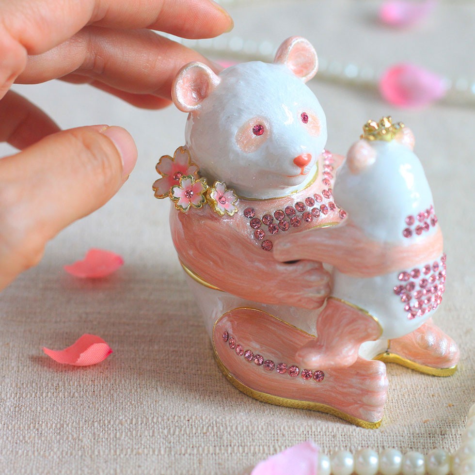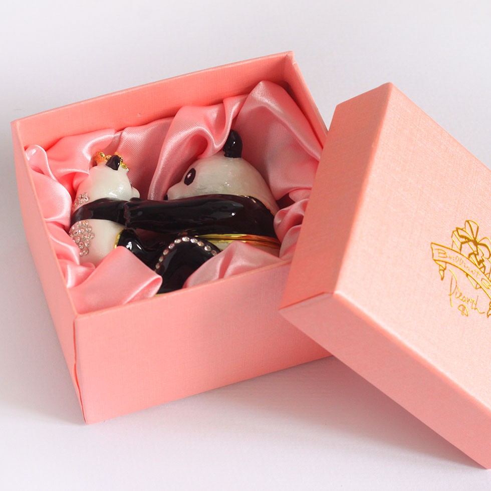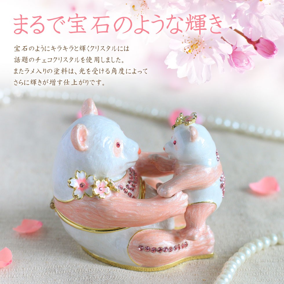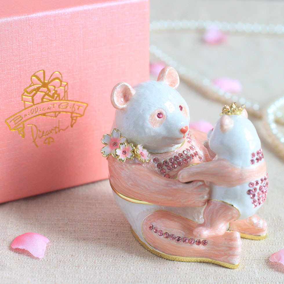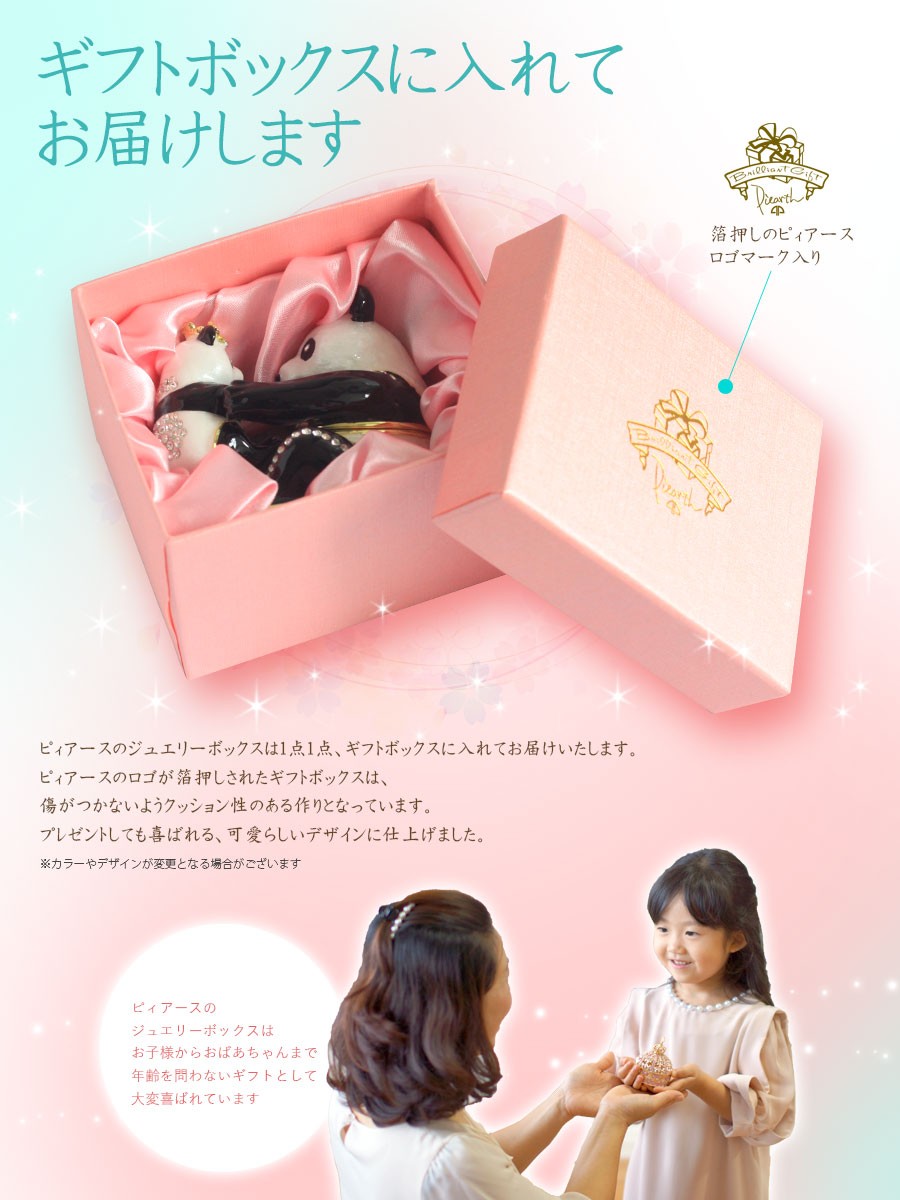 | ジュエリーボックスと言えば、指輪やピアス、ネックレスなどのアクセサリーを入れる引き出し型のケースを思い浮かべる方が多いかもしれません。 ピィアースのジュエリーボックスは、動物や花などをモチーフに作られ、合金製でずっしりとした重さがあります。また高品質のクリスタルガラスを贅沢に使用。まるでジュエリーボックスそのものが宝石のような、高級感溢れる仕上がりです。 小物入れとしても使えるように開閉口には磁石が取り付けてあり、アクセサリーなどなくしやすいアイテムの収納ができます。キラキラと美しく輝く宝石箱は、そのまま飾って楽しめるインテリア雑貨として多くの方に愛されています。 国内トップクラスのジュエリーボックスメーカーであるピィアースは、2004年ごろから本格的に宝石箱の製造を始め、現在のジュエリーボックスはなんと300種類以上。大規模展示会でもご好評いただいており、全国有名百貨店でも販売されています。 自社工場でひとつひとつ丁寧に手作りし、原型作成、研磨、加工、着色、小さなクリスタルガラスの取り付けなども全て手作業で行われるこだわりのハンドメイド品。完成後は厳しい検品の後、丁寧に梱包作業をしお客様にお届けしております。 ピィアース商品は、全国有名百貨店および全国有名宝石店チェーンにてお取り扱いいただいている高品質商品です。 ★自分へのご褒美に…コレクションして並べて飾ると、さらにかわいらしさUP! ★恋人へのプレゼント…中にアクセサリーを入れて、サプライズな贈り物として ★家族への感謝ギフト…お母さんや姉妹へ、日頃のありがとうの気持ちを込めて ★誕生日プレゼント…お友達の喜ぶ顔が見たいから、いつもと違うキラキラギフトを ★小さな女の子へ…まるでお姫様が使っているようなキラキラ宝石箱は女の子の憧れ! |