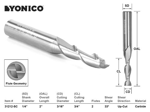 Yonico 31212-SC CNC Router Bit Up Cut Solid Carbide with 3/16-Inch X 3/4-Inch X 1/4-Inch X 2-Inch 1/4-Inch Shank