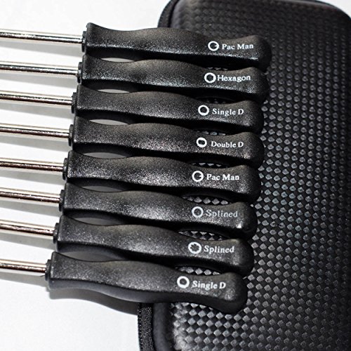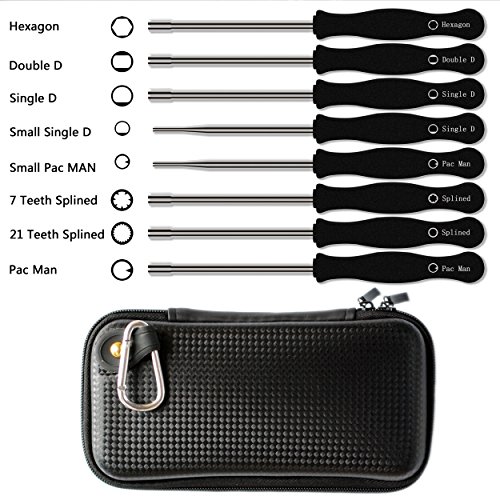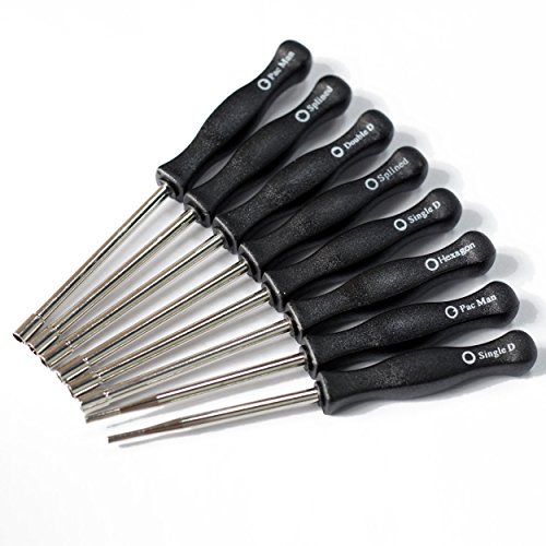 8 Pcs different screwdrivers , 21 Teeth Splined + 7 Teeth Splined + Single D + Small Head Single D + Double D + Pac Man + Small Head Pac Man + Hexagon.