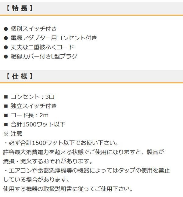 電源アダプター用コンセント付き。丈夫な二重被ふくコードです。 生産国:中国 ※サプライヤー直送品 ご注文後3~4営業日後の出荷となります【商品名】OHM 個別スイッチ付き 節電タップ 3個口 2m HS-T1388W