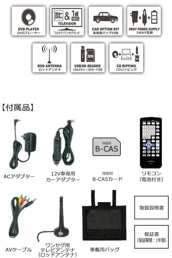 | フルセグ/ワンセグ搭載の3電源方式&スイーベル180度反転!!USBメモリー・SDカードに対応しています。CDリッピング機能も搭載しています。フルセグ・ワンセグ搭載ポータブルDVDプレーヤーです。 |