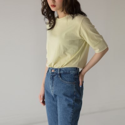 화사한 컬러감이 시선을 사로잡는 티셔츠입니다. 부드러운 촉감의 코튼 티셔츠로 피부가 예민하신 분들도 부담없이 착용하기 좋은 아이템으로 얇은 두께로 지금부터 여름철까지 꾸준히 즐길 수 있는 티셔츠입니다. 너무 짧지 않은 5부 소매로 깔끔하게 연출되며 소맷단이 넓게 제원단 시보리 처리되어 은근한 포인트를 주었습니다. 베이직한 핏으로 데일리하게 즐기기 좋으며 화사한면서도 은은한 컬러 구성으로 전컬러 모두 추천드리는 아이템입니다.