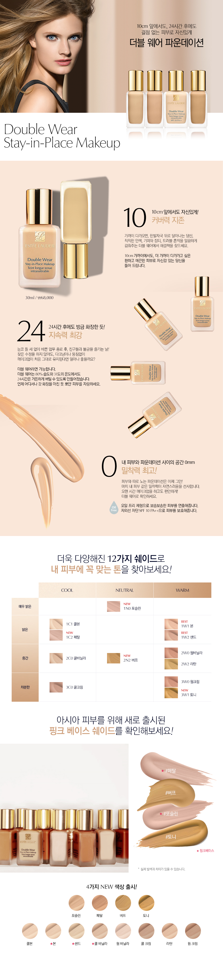 가까이서 보아도 결점없는 피부를 연출해주는 에스티 로더 파운데이션 피부 톤에 보다 자연스럽게 밀착되어 변색없이 오랫동안 그대로 유지됩니다. -가볍고 편안하게 피부에 일착되며, 벨벳같은 부드러움을 선사합니다. -자외선 차단: SPF10, PA++