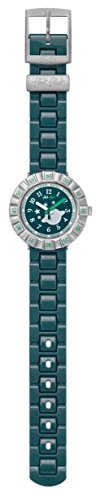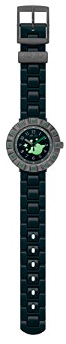 Flik Flak CA Tourne Green Dial Plastic Strap Boy's Watch ZFCSP064. 34 mm silver tone plastic case with a green dial, a plastic crystal, green and white hands, and silver Arabic numeral hour markers. Minute markers around the rim. Logo beneath the 12 o'clock position. Features: shock resistant, machine washable, and glow in the dark planet and stars on the inner dial. Minute scale on the bezel. Hands: hours, minutes, and seconds. Case thickness of 10 mm. Push / pull crown. 15 mm green plastic strap with a buckle clasp. Quartz movement and water resistant up to 30 meters. Style: casual watches. CA Tourne series.Feature