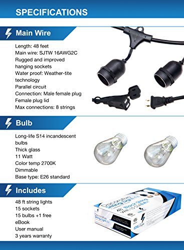 SHOP RISK FREE: We’re offering 3-year warranty, if FOR ANY REASON you’re not COMPLETELY SATISFIED with your purchase, you can return it for a full refund or immediate replacement. As a special thank you for shopping with us, your order will include BONUS eBook: How to design Exterior lights: outdoor patio lights, cafe lights, backyard lights, outside lighting, gazebo lights, bistro lights, deck lighting and pergola lights. We will also include 1 free replacement bulb, just in case.