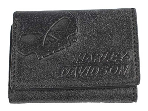 -. Feature : Harley-Davidson Men's Skull Graphite Leather Tri-Fold Wallet / Black & Gray distressed leather / Debossed & buffed Willie G Skull logo with Harley-Davidson® font logo / Interior features 8 credit card slots, zippered coin pocket and cash slot / Size: 4.5" L x 3.5" H
