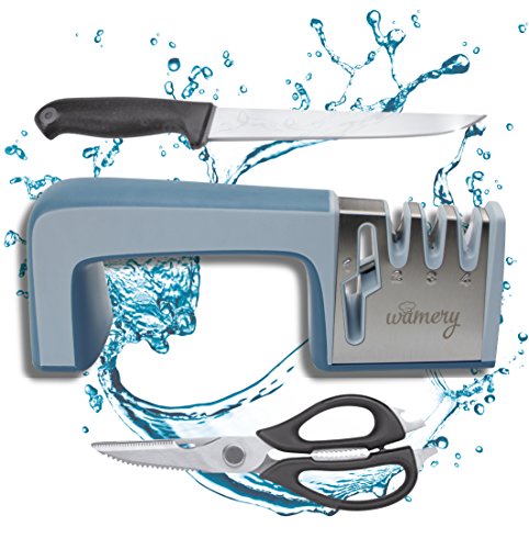 Knife Sharpener and Scissors Sharpening System. Easy to use. Safe Handle. Stainless Steel Blades. For every Kitchen tool. 4 in 1 Diamond Coated & Fine Ceramic rod. Professional chef sharp in seconds!