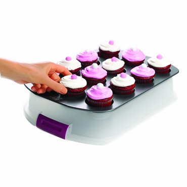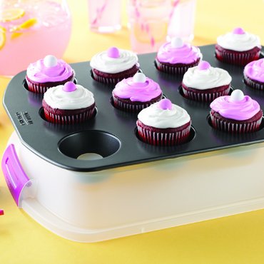 -. Feature : Bake, take, lift and serve perfect cupcakes every time. / Innovative lid converts to a base to elevate your cupcakes. / Raised serving eliminates damaged decorations, sticky fingers, and mess. / Durable snap-fit latches and top handle for easy transport. / When not in use, the non-stick pan and lid nest for streamlined storage.