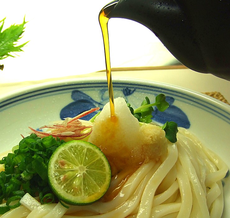 多目のお湯で麺を茹でた後、流水でもみ洗いします。表面のぬめりが取れれば完成。ざるうどんやひやしうどん、ぶっかけうどん、かけうどん、天婦羅うどんや月見うどんで頂きます。半生讃岐うどんでは、上記水洗い後一度温め直してから釜玉うどんや釜揚げうどんにします。