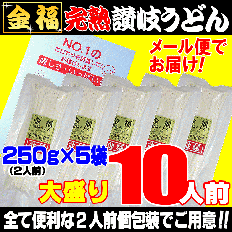 名称完熟讃岐うどん10人前つゆなしセット(生讃岐うどん) ■原材料名------------------小麦粉(ASW、讃岐の夢2000)、食塩、加工澱粉、酒精■内容量------------------金福完熟讃岐うどん(半生麺)・並麺1袋(250g)×5袋(10人前)■賞味期限 常温------------------金福完熟讃岐うどん・並麺約45日■お届けの目安------------------当店出荷後、日祭日を除く7日以内■その他注意事項のし、包装、メッセージカード、日時指定全て不可。贈答に向きません。宅配便で送る場合、送料追加されます。