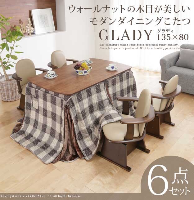 こたつ 北欧 長方形 モダンダイニングこたつ グラディ 135×80cm6点セット(こたつ+専用省スペース布団+肘付き回転椅子4脚)
