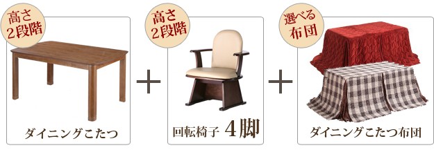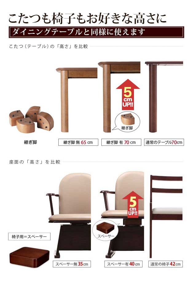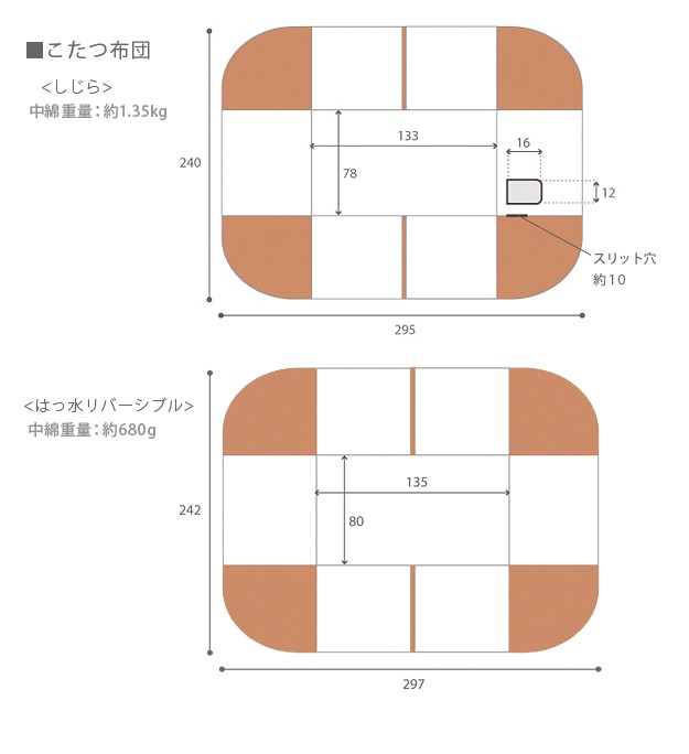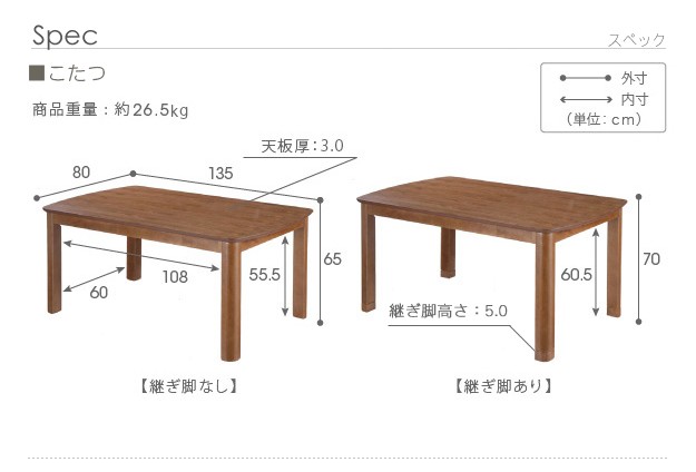 サイズ(cm):こたつ-幅135x奥行80x高さ70(65)・約26.5kg、椅子-幅58x奥行53.5x高さ78(73)・約12kg、布団-295x240cm