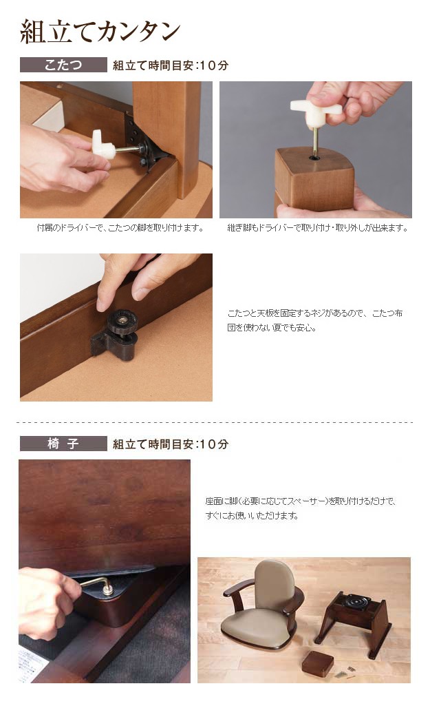 材質:こたつ天板-天然木化粧繊維板(ウォールナット)、椅子フレーム-天然木(ラバーウッド)、布団表地-しじら/綿100%、レンガ・ベージュ/ポリエステル100%(撥水フランネル)