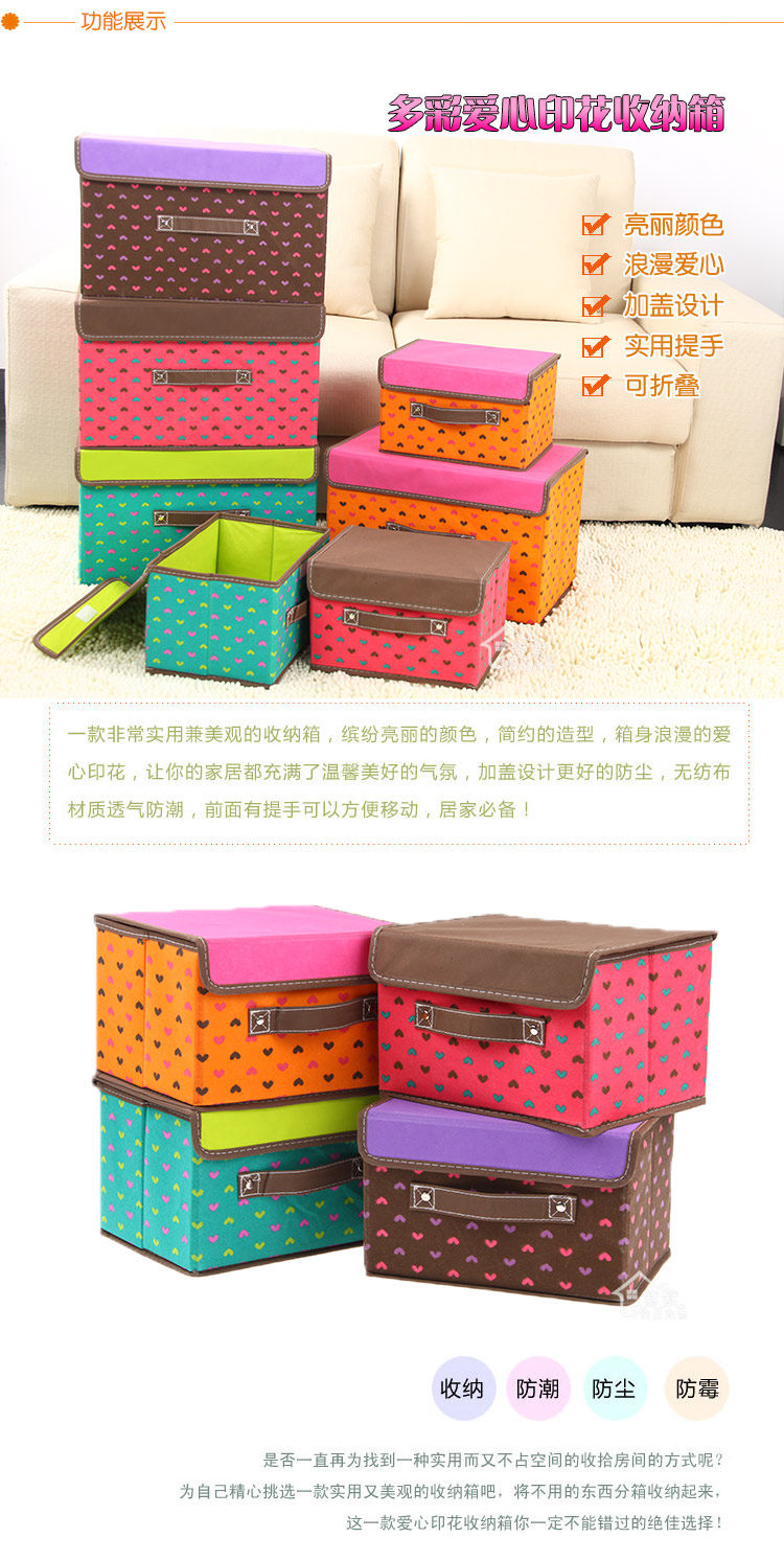 A very practical and beautiful storage box, colorful bright colors, simple shapes, box body romantic love stamp, make your home full of warmth and good atmosphere, stamped design better dust, woven breathable material proof, in front of the handle can be easily moved, home essential!