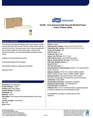 -. Title : Tork Advanced 101293 Soft Xpress Multifold Paper Hand Towel, 3-Panel, 2-Ply, 9.125" Width x 9.5" Length, White (Case of 16 Packs, 189 per Pack, 3024 Towels)