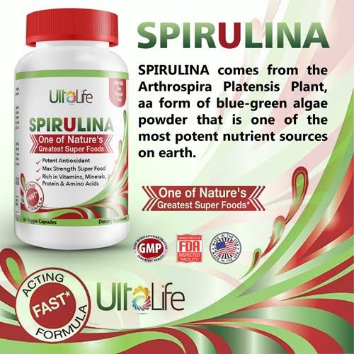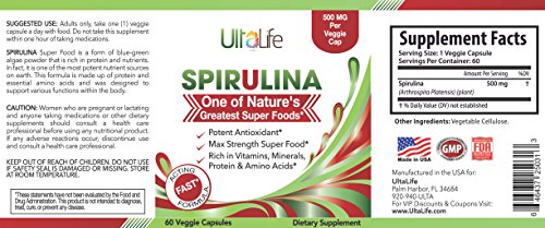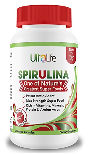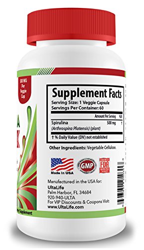 - Feature : SPIRULINA IS A POTENT NATURAL ANTIOXIDANT, EXTREMELY HIGH IN MANY NUTRIENTS- More iron than spinach and more beta carotene than carrots. UltaLife Spirulina supports eye health, immune function, healthy cholesterol levels, cellular health, metabolism boost and increased energy. Spirulina is low in calories and a complete source of protein-- which makes it an awesome help with weight loss. / SPIRULINA IS ONE OF NATURE'S GREATEST SUPER FOODS. These 500mg super food formula capsules are rich in Vitamins, Minerals, Protein & Amino Acids with NO NASTY AFTER TSTE! Packed with fiber, protein, vitamins (ex: vitamins A, B1, B2, B6 and K), essential minerals like iron, calcium and magnesium, trace minerals, essential fatty acids, nucleic acids polysaccharides and antioxidants. An amazing vegetarian whole superfood to increase energy, aid in weight loss and detox your body. / BIG DIFFERENCES BETWEEN CHLORELLA AND SPIRULINA? Spirulina is a blue-green algae that is thousands of year older than chlorella. Spirulina contains more protein than chlorella-- on average spirulina contains 12 times more protein than beef! Spirulina is a better source of GLA (gamma-linoleic acid), a 'good' fat that is essential for healthy brain & heart function. Spirulina contains higher concentrations of phycocyanin, a phytochemical that gives spirulina its special blue tint. / YOU CAN TRUST ULTALIFE: 100% safe and natural Veggie Capsules. No artificial ingredients, no fillers or binders. We use only the very best quality ingredients. UltaLife's Spirulina supplement is manufactured in USA in an FDA-inspected, state-of-the-art facility with strict adherence to good manufacturing practices. UltaLife manufactures only high quality, premium high potency vitamins, capsules, pills, tablets, powders, multivitamins and supplements for men and women. / GUARANTEED RESULTS OR YOUR MONEY BACK! Put ULTALIFE SPIRULINA to the test and experience the results for yourself with absolutely no risk. But don't just keep it to yourself... SHARE THE LOVE - Consider ordering one bottle for yourself and another for a friend, family member or loved one. See the specials on this page for MULTI PRODUCT DISCOUNTS! CLICK ADD TO CART NOW.
