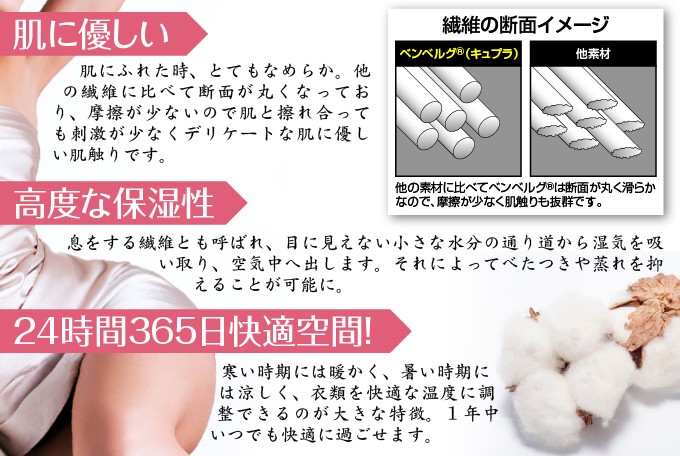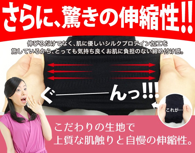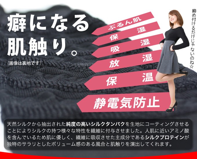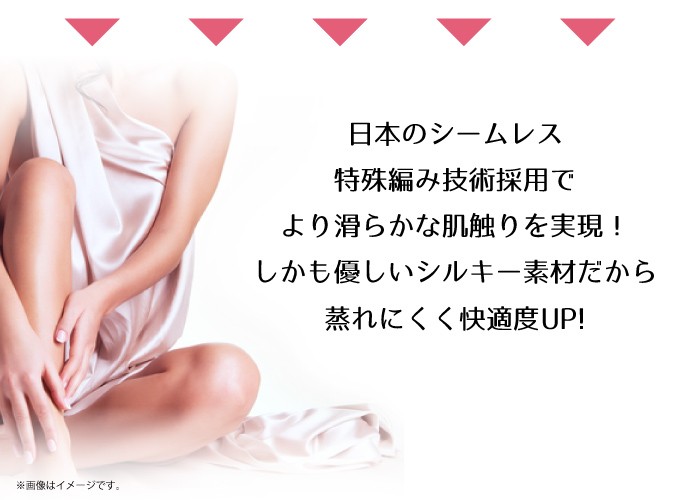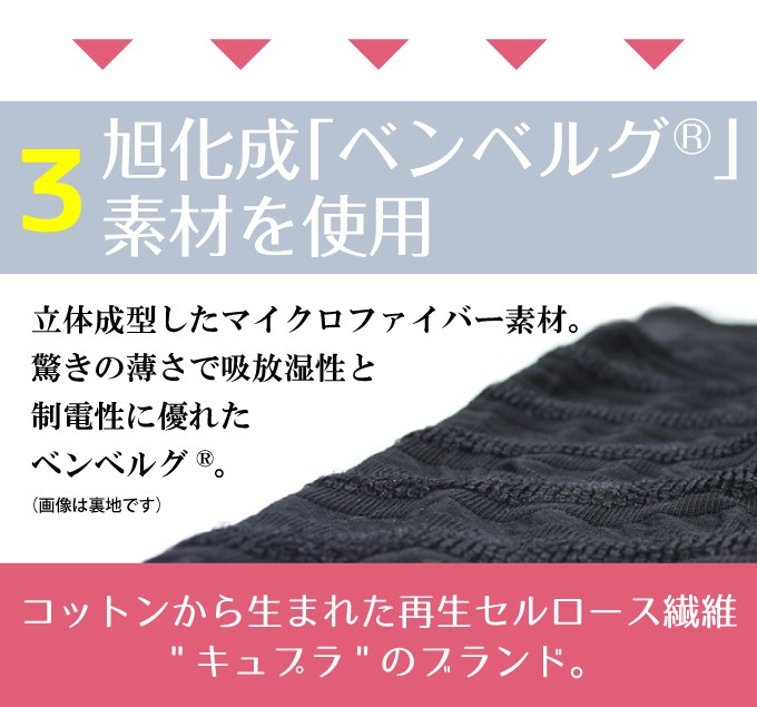 | 素材・材質 | 身生地:ナイロン66%・キュプラ18%・ポリウレタン16% テープ部:ナイロン88%・ポリウレタン12% ※キュプラには旭化成「ベンベルグ(R)」使用 ※生地全体にシルクプロテイン加工 |