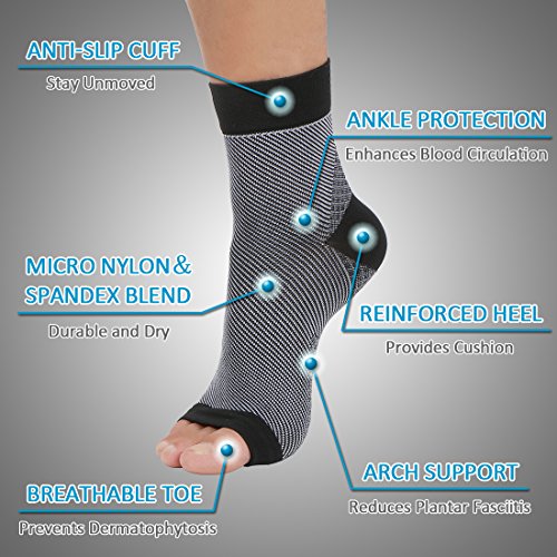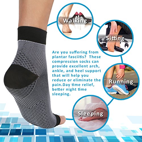 - PAIN RELIEF: Suffering from plantar fasciitis is no joke, and we know it. These compression sleeves have been designed to provide excellent ankle, arch, and heel support that will help you achieve a reduction or elimination of your pain. Day time relief, better night time sleeping, and happier feet are coming your way! Also perfect for plane travel, pregnancy, varicose vein treatment, and more.