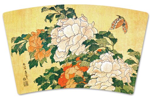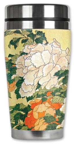 Mugzie Hokusai Peonies & Butterfly Travel Mug with Insulated Wetsuit Cover, 16 oz, Black