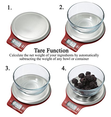 - EASY-TARE FUNCTION: Features a Tare Button, which calculates the net weight of your ingredients; automatically subtracts the weight of any bowl or container