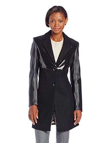 Two-button wool-blend coat with sequined yoke featuring faux-leather sleeves