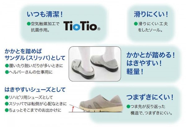 かかとを踏めば使い方2通り!!内部は、空気触媒清潔加工TioTioによる抗菌加工。つま先はそりあがった形状になっており、つまずきにくい構造です。両サイドには反射ラインが入っています。 |