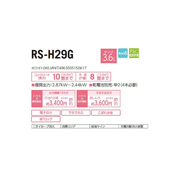 원본상품명:TOYOTOMI 石油ストブ 「コンクリト10/木造8」 キャリングハンドル付き 日本製 ホワイト RS-H29G(W)