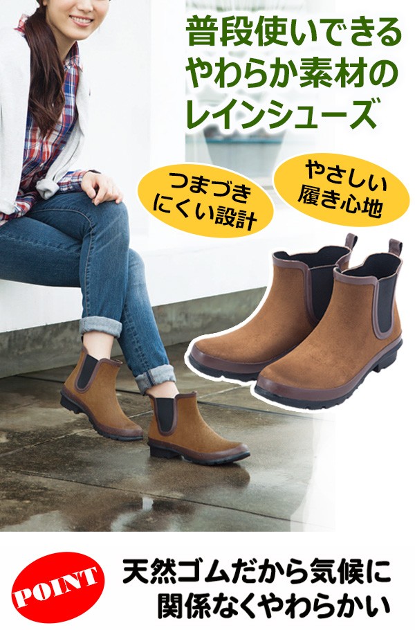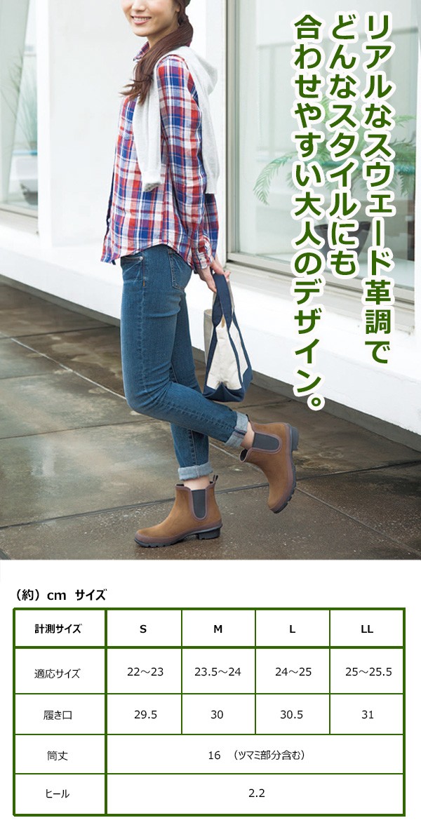 | 天然ゴム製でとっても柔らかいショートブーツタイプのレインシューズ。リアルなスウェード革調の質感でどんなスタイルにも合わせやすい大人のデザイン。 |