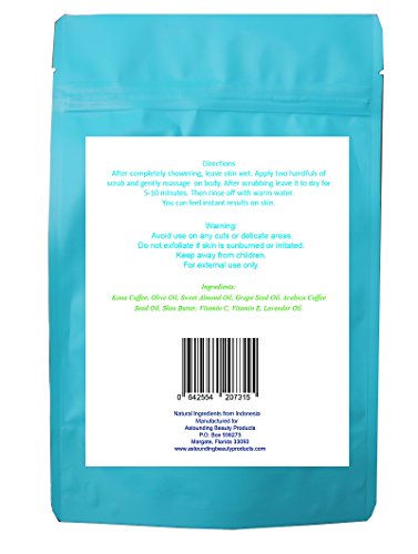 Studio : Astounding Beauty Products Publisher : Astounding Beauty Products Binding : Health and Beauty Product Description Natural ingredients your skin loves made of the finest coffee and natural plant oils skin exfoliating, moisturizing. Removes dead cells. Treats rough skin, makes your skin super smooth. Stimulates new cell rejuvenation. Use scrub 1-2 times per week. Shower and leave skin damp. Use about 2 small handfuls of Arabica coffee scrub to cover your body. With circular motions massage the scrub on your skin, concentrating on problem areas. Leave for 5-10 minutes. Rinse off and feel the difference. 0