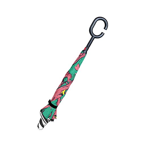 -. Feature : Inverted Design - Double Layer Inverted Umbrella with Unique Pattern, inside-out design prevents water from dripping, keeping floors and cars dry. / Hands Free - C shape handle, cross the C-shape handle over your arm and made you hands free. / Double Layer Umbrella - Made of 100% Polyester fabric, durable black ribs(glass fiber) and double layer make the umbrella more sturdy, enhance its windproof effect. / Easy to Storage - The inverted umbrella can stand up on its own, ideal for when you have nowhere to prop your umbrella up against. It will also keep the wet part of the umbrella inside once you've closed it. / Digital Printing Technology - Inner fabric of umbrella using digital printing, to prevent fading. Outer fabric is made of pure black ultra-waterproof cloth. / Note - As pictures show, the "ALAZA" in the inner layer of reverse umbrella will be PUNCHED to vent, in order to more easily open the umbrella.