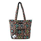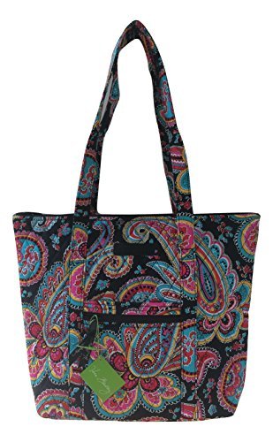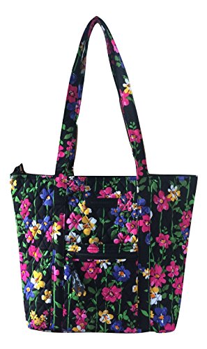 Vera Bradley's durable and spacious Villager Tote is made of soft quilted fabric with a removable sturdy fabric covered bottom insert. The fully zippered top closure reveals a lined interior featuring 6 open slip pockets. This series has been updated with coordinating solid quilted solid interiors. The front offers a small zippered pocket and the dual straps have a very comfortable drop of about 10.5 inches. The Villager is versatile and makes for a great, every day tote - whether for school, work, the beach, or the gym. It makes a great carry-on bag for travel, or even a compact beach bag! It is lightweight, and easily maintained. Just remove the sturdy fabric covered insert and it can be placed in the wash. It measures 13 inches long x 13 inches high x 4 inches wide. The Villager is smaller than the Vera Tote, and slightly larger than the Tote. Machine wash cold, gentle cycle, only non-chlorine bleach as needed, line dry. Patterns with solid color interiors are designed and produced for Vera Bradley Outlet stores.Feature