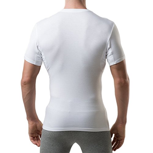 Binding : Apparel Product Description The Thompson Tee with Hydro-Shield Sweatproof Technology is a patented undershirt that blocks underarm sweat, preventing embarrassing wet marks and yellow stains. 95% Ultra soft, premium bamboo and 5% Spandex for maximum comfort (exclusive of Hydro-Shield). Anti-microbial (fights odor) and Hypoallergenic. Fully integrated design provides a sleek and consistent look and feel (not just a patch sewn over top or inside a regular undershirt. The sweat proof barrier is built into the undershirt). Tagless lay-flat collar. Stay tucked in with added length. Whether you suffer from Axillary Hyperhidrosis (excessive underarm sweat) or simply need some added confidence for that special day or meeting, the Thompson Tee with Hydro-Shield Sweatproof Technology combines the best features of an undershirt with our proprietary sweat proof technology to guarantee peace of mind in any situation! Machine washable dryer safe. NOT chemically treated in any way so it will NOT lose effectiveness. We recommend turning the garment inside out when washing and drying to ensure the fabric exposed to the skin and sweat is thoroughly cleaned and dried. It can also be hung to line dry in the sun as well. Please see your neck label or our website (www.thompsontee.com) for complete care instructions. Every Thompson Tee with Hydro-Shield Sweatproof Technology comes with a Sweat Proof Guarantee. We guarantee that your underarm sweat will not penetrate our sweat proof barrier! Thank you for your support - proudly made in the U.S.A.! 0