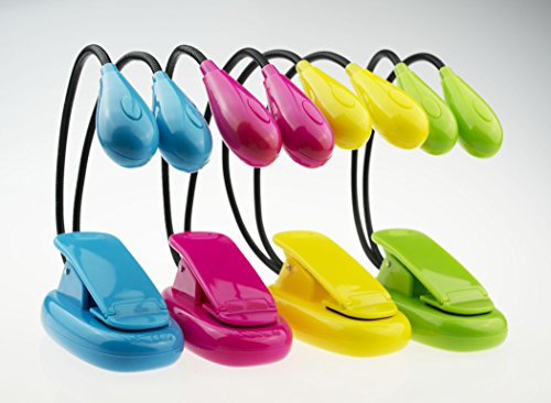 Brand new adjustable neck LED clip on reading light, 4 piece set. Comes in colors: Yellow, Hot pink, Blue and Green. Each light has its own individual packaging, a great set to share with families and friends, or to leave in multiple locations.