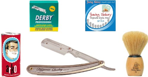 -. Title : Shaving Factory Rasur Geschenk-Set inklusive Parker 31R Edelstahl Gerades Rasiermesser/ Rasierer, 100 Derby Professionelle Einzelklingen/Rasierklingen, Arko Rasierseife und Shaving Factory Hand gefertigter Rasierpinsel