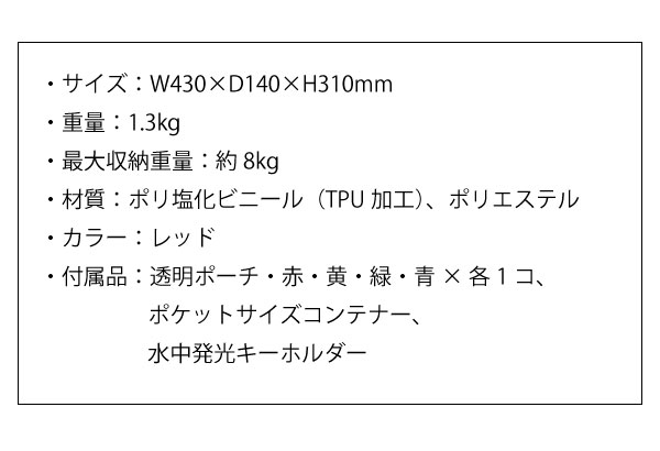 ●付属品:透明ポーチ・赤・黄・緑・青×各1コ、ポケットサイズコンテナー、水中発光キーホルダー