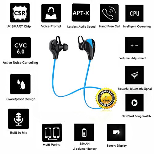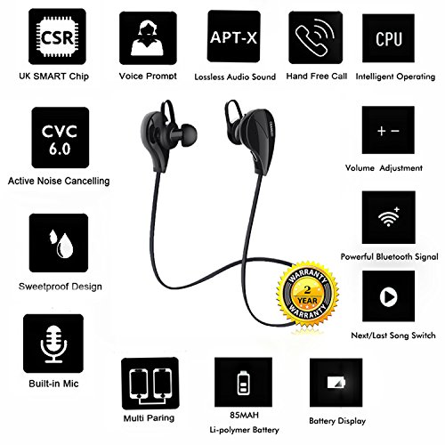 Multipoint pairing (up to 2 phones) Voice command for picking up / rejecting calls Built-in 14.2mm nedymium driver Clear bass resonance, CVC wind noise reduction, and superior sound isolation Frequency range: 2.4GHz-2.48GHz Operating distance: Up to 10m (free space) Bluetooth profiles: A2DP, AVRCP, HSP, HFP Standby time:Up to 200hrs Talk/music playtime:Approximately6-8hours