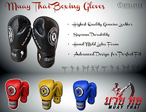 -. Feature : Muay Thai Boxing Gloves - Highest Quality Genuine Leather / Durability with Velcro Closure / Hand Made Mold High Performance Latex Foam / Advanced Design to Provide a Snug and Secure Fit