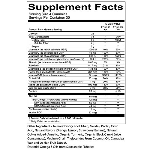 SmartyPants Kids Complete and Fiber is more than a multivitamin. We’re the galaxy’s best tasting gummy multivitamin with vitamin D3, 4 g prebiotic fiber, and omega 3 fish oil – all in one. We use premium nutrients, and include the forms of these nutrients that are easily absorbed by the body whenever possible. SmartyPants are non-GMO and allergen-free, with no synthetic colors, flavors, or preservatives. Each batch is 3rd party lab tested. For every bottle sold, we make a 1-for-1 nutrient grant to Vitamin Angels. SERVING SIZE IS FOUR GUMMIES – since we’re packed with such large amounts of nutrients and fish oil, we spread them out over a couple gummies so there’s ZERO fishy or vitamin-y taste. Please always refer to the supplement facts and ingredient section listed on the package label for information related to the purchased product. Actual product packaging and materials may contain different information than what is shown on this page.Feature