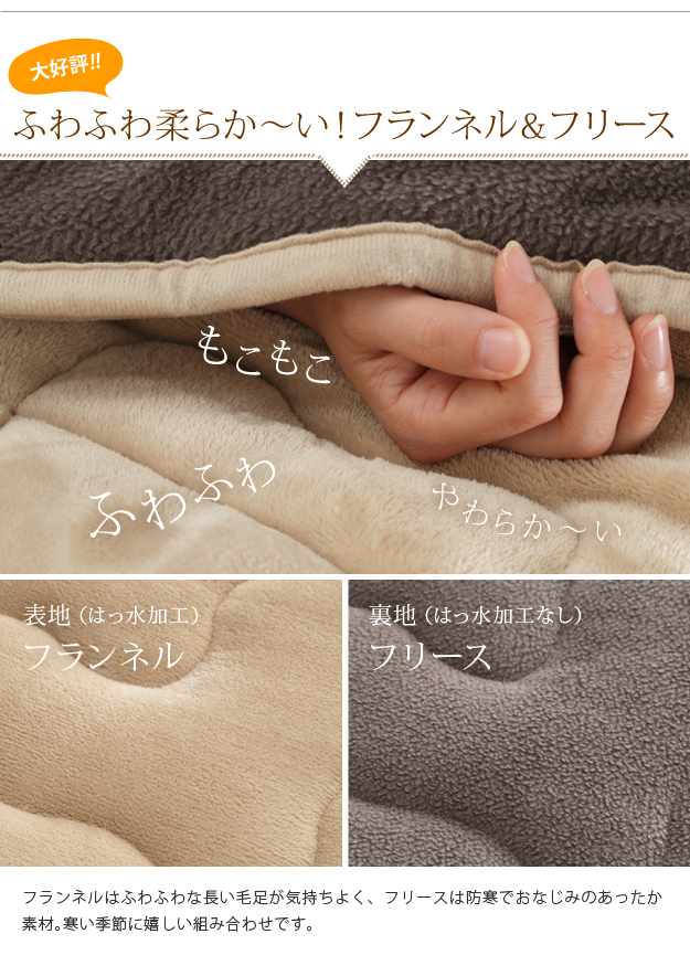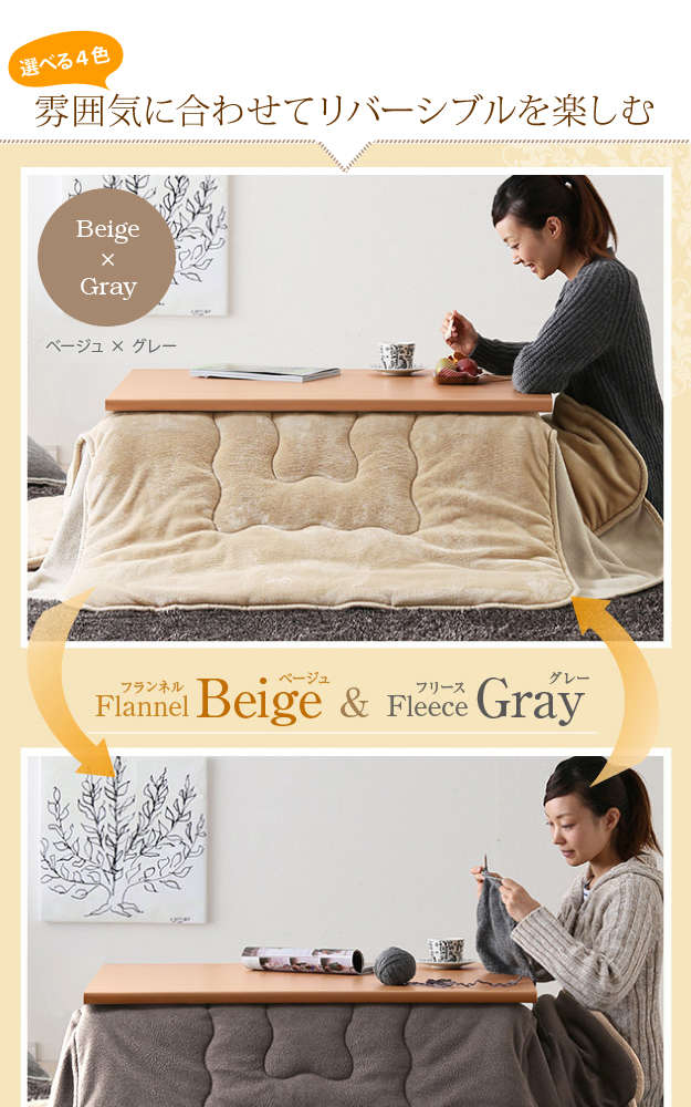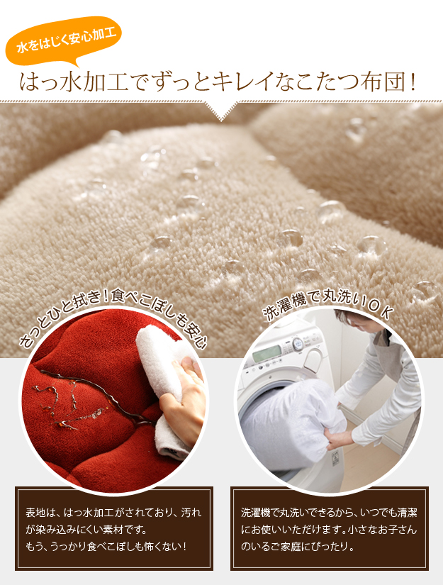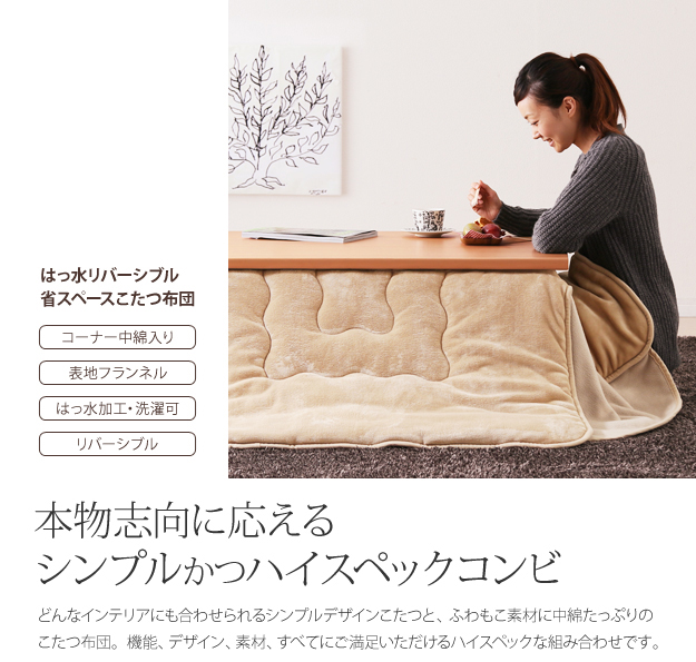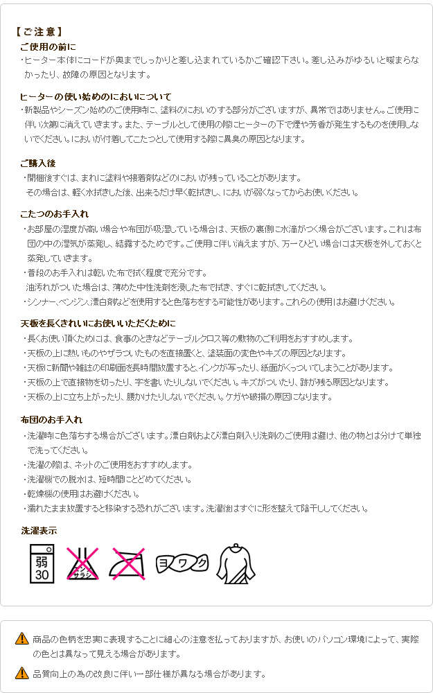 ●材質:こたつ天板-繊維板・UV塗装(オーク柄木目転写)、こたつ脚部-天然木(ラバーウッド)、布団表地-ポリエステル100%(撥水フランネル)、布団裏地-ポリエステル100%(フリース)、中綿-ポリエステル100%